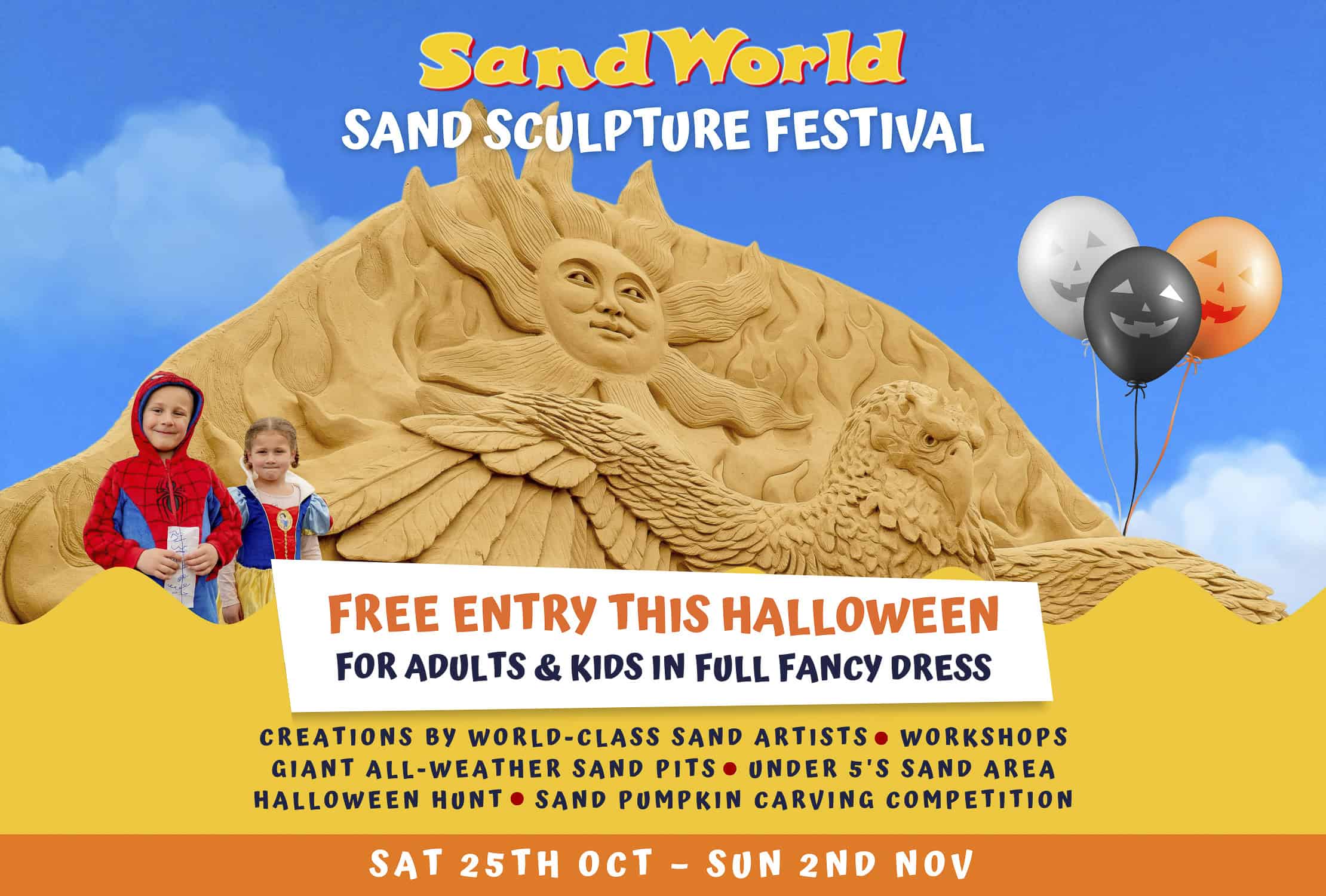 All adults and kids in FULL fancy dress can visit SandWorld FOR FREE from Saturday 25th October – Sunday 2nd November.