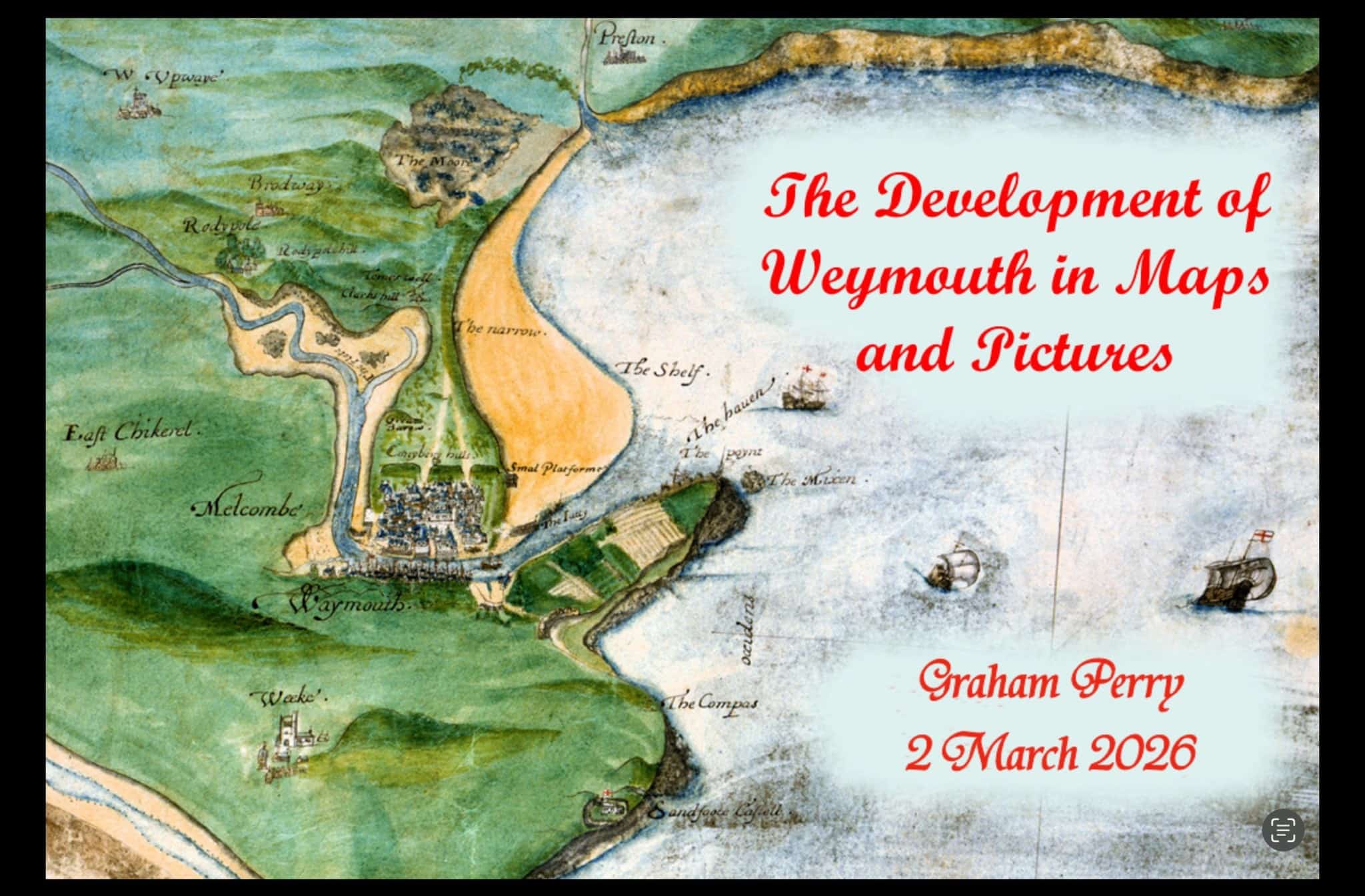 The talk by Graham Perry gives an overview of the growth of the current town of Weymouth from Roman times up until the twentieth century.