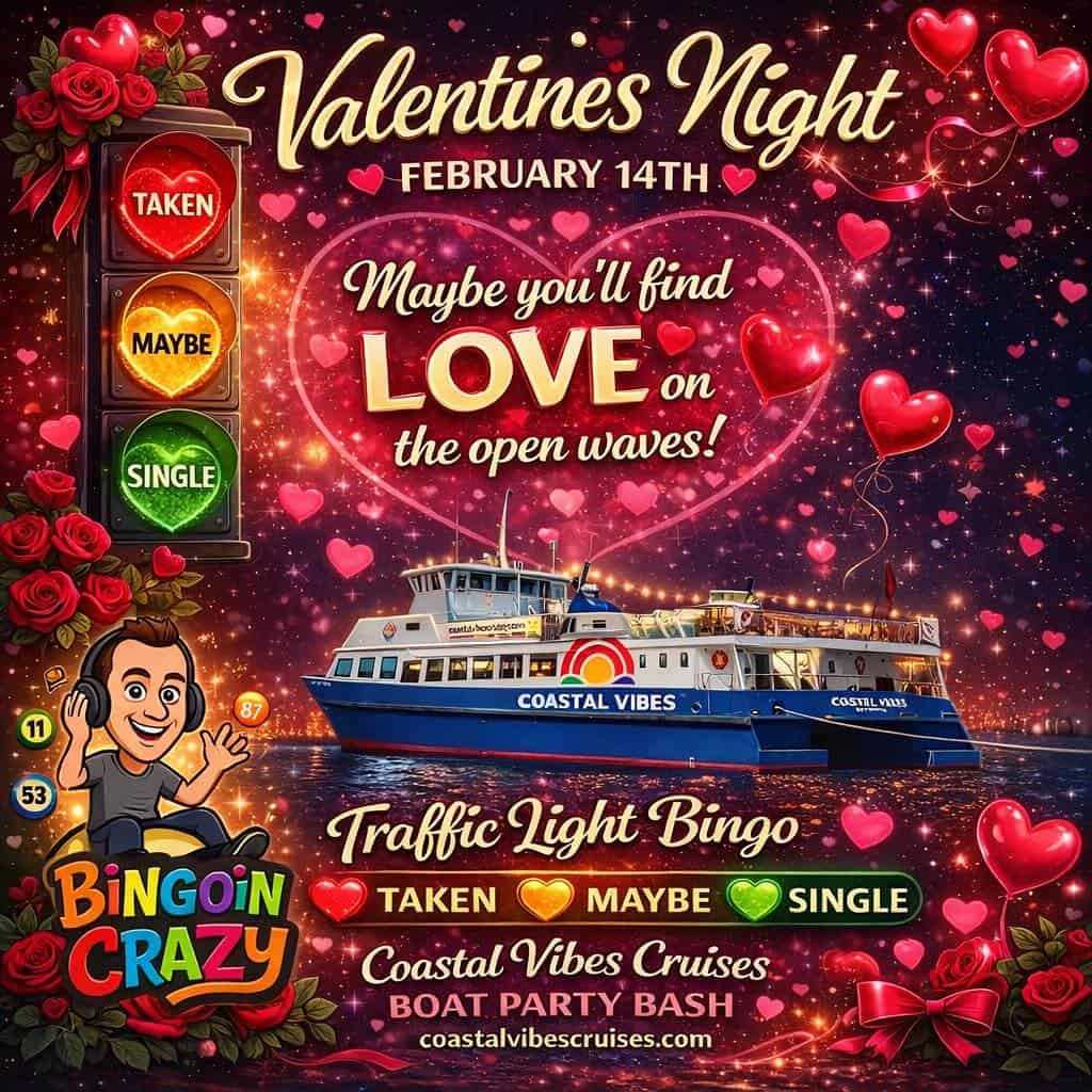 Step aboard Coastal Vibes for a Valentine’s party that keeps things fun, social, and pressure-free. Our Traffic Light system takes the guesswork out of mingling, showing who’s open to chatting, who’s just here for the vibes, and who’s happily taken – all in a relaxed, respectful way.