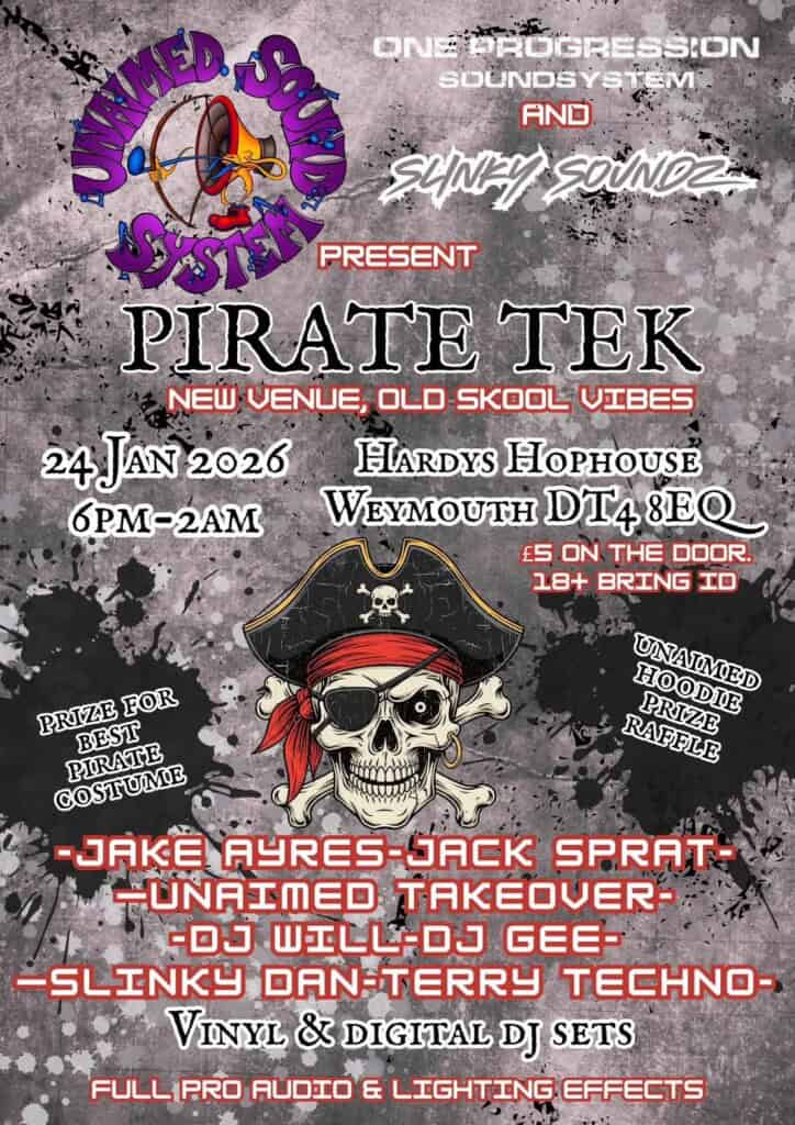 Pirate Tek brings old-school rave and techno vibes to Hardy’s Hop House with a high-energy night of vinyl and digital DJ sets in Weymouth.