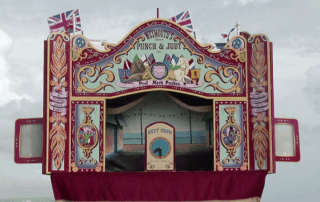 Weymouth's Prof. Mark Poulton talks about the history of  Punch and Judy at the seaside to a backdrop of  a gathering of Punch and Judys from across the country in Weymouth
